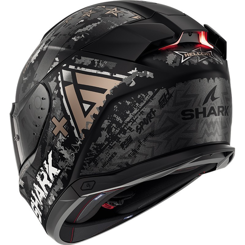El Shark Skwal i3 Hellcat Mate es el primer casco integral de moto inteligente con luces de posición LED y luces de freno activas de serie y cuenta con la homologación ECE 22-06.